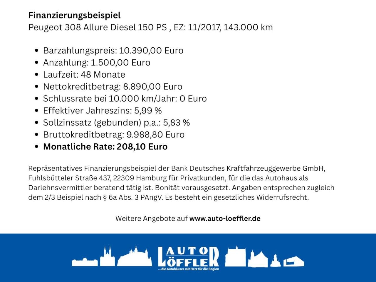 • *Repräsentatives Finanzierungsbeispiel der Bank Deutsches Kraftfahrzeuggewerbe GmbH, Fuhlsbütteler Straße 437, 22309 Hamburg für Privatkunden, für die das Autohaus als Darlehnsvermittler beratend tätig ist. Bonität vorausgesetzt. Angaben entsprechen zugleich dem 2/3 Beispiel nach § 6a Abs. 3 PAngV.